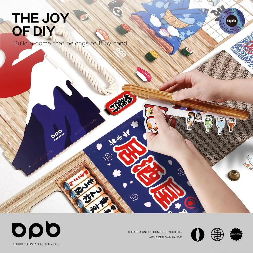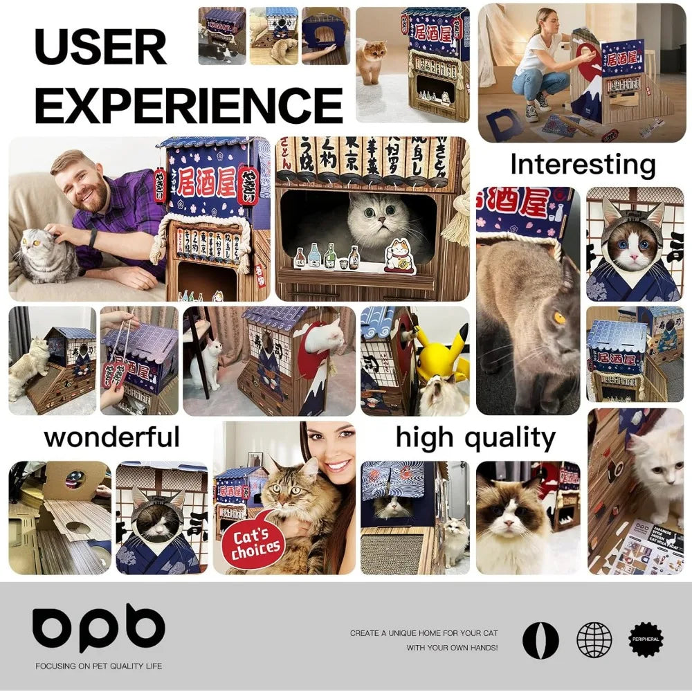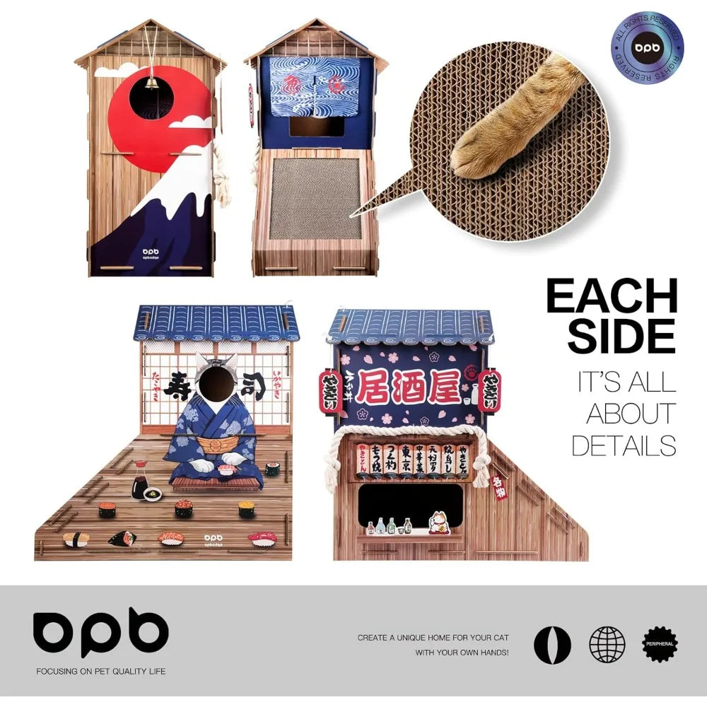 - 【Features on All sides】: Front: double-story izakaya bar where cats can pretend to open a Japanese cat house tavern. Back: cat pokes out its head as if it's making sushi itself, very cute. Left: comes with a metal cat bell that makes a crisp ringing sound when cat scratches. Right side: with a sloped cat scratching board to satisfy the cat's need to sharpen its claws.